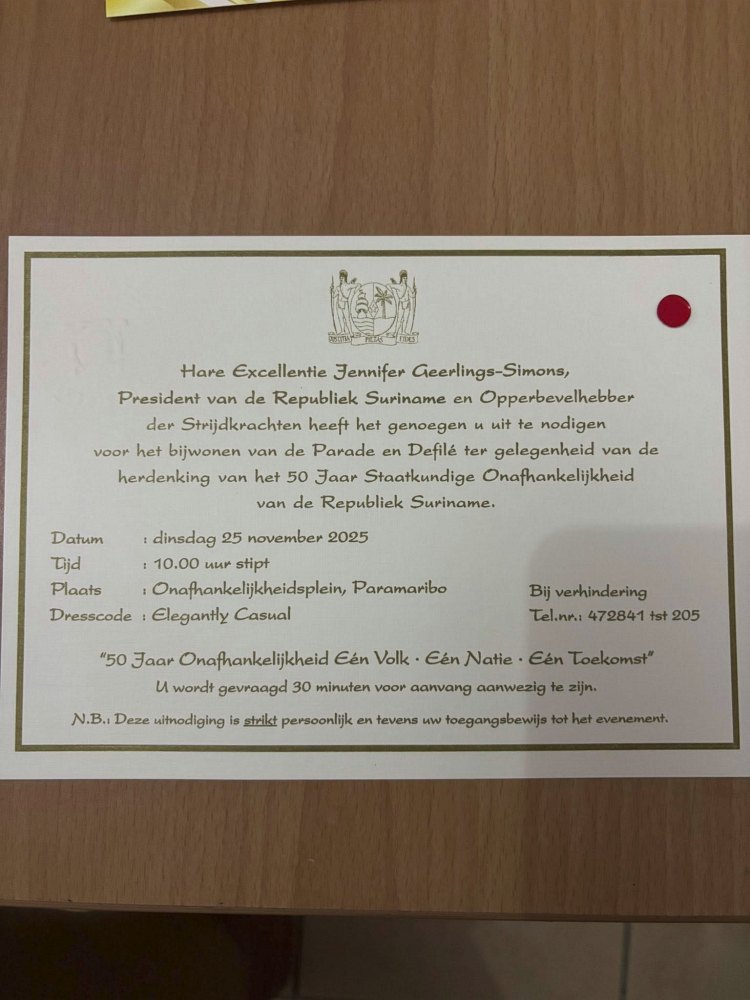 Also, an invitation from the President of the Republic of Suriname, Her Excellency Jennifer Geerlings-Simons, for the swearing-in of the Council of Ministers for the 2025–2030 term at the Presidential Palace, Independence Square 1 in Suriname.
